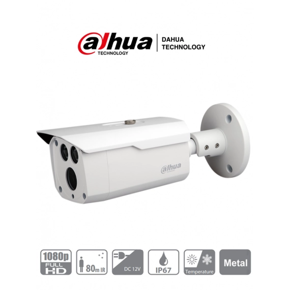 Cámara Dahua 2MP HDCVI con lente fijo, IR inteligente de 80 m, carcasa metálica IP67 y excelente desempeño para vigilancia exterior de largo alcance.