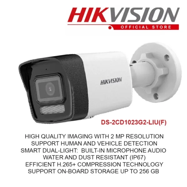 Cámara de seguridad HIKVISION DS-2CD1023G2-LIUF 2MP con micrófono, visión a color nocturna, luz blanca inteligente y protección IP67. Ideal para seguridad profesional.