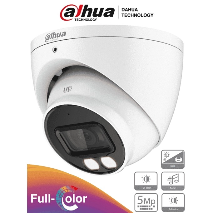 Cámara domo Dahua 5MP Full-Color con LED integrado, visión nocturna en color, micrófono incorporado y excelente rendimiento para seguridad 24/7.