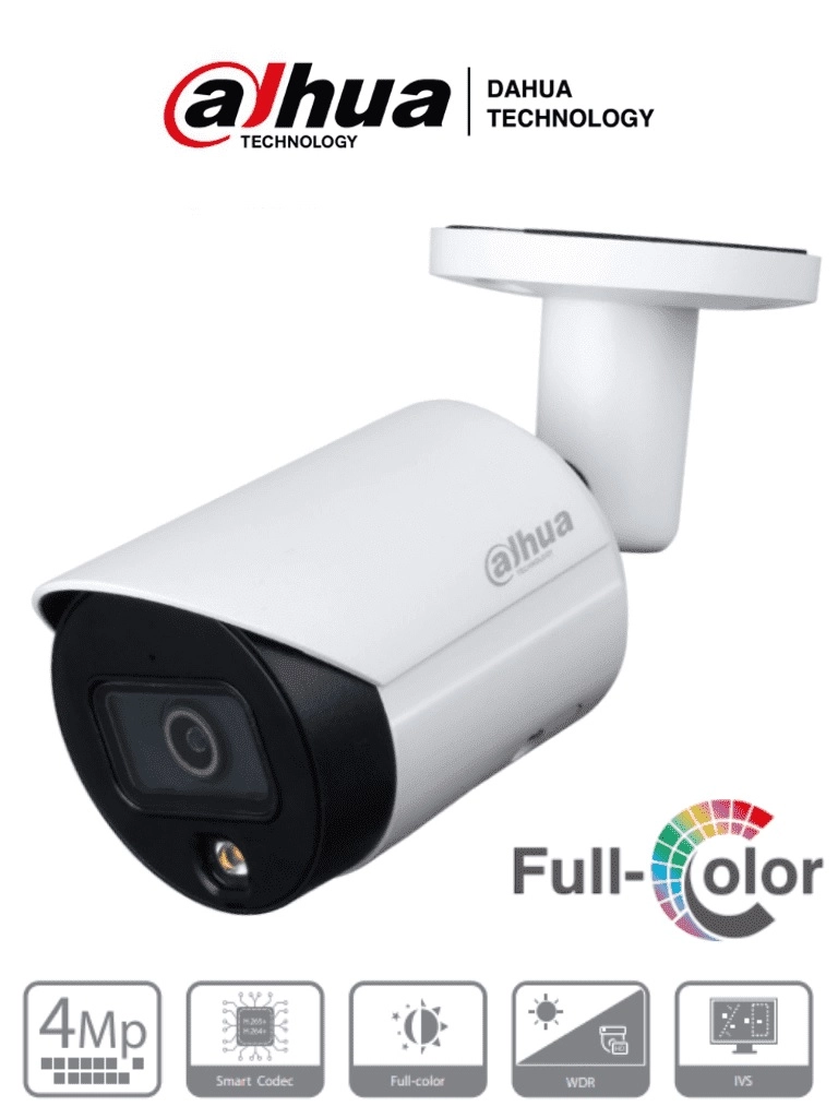 Cámara IP Dahua 4MP Full-Color con luz LED, visión nocturna a color, micrófono incorporado, PoE y protección IP67 para máxima seguridad.