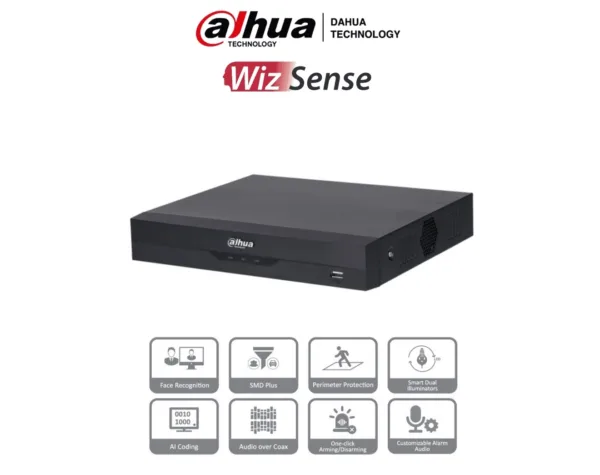 Grabador digital DVR Dahua de 4 canales Full HD con IA WizSense, compresión H.265+ y funciones inteligentes para vigilancia profesional.