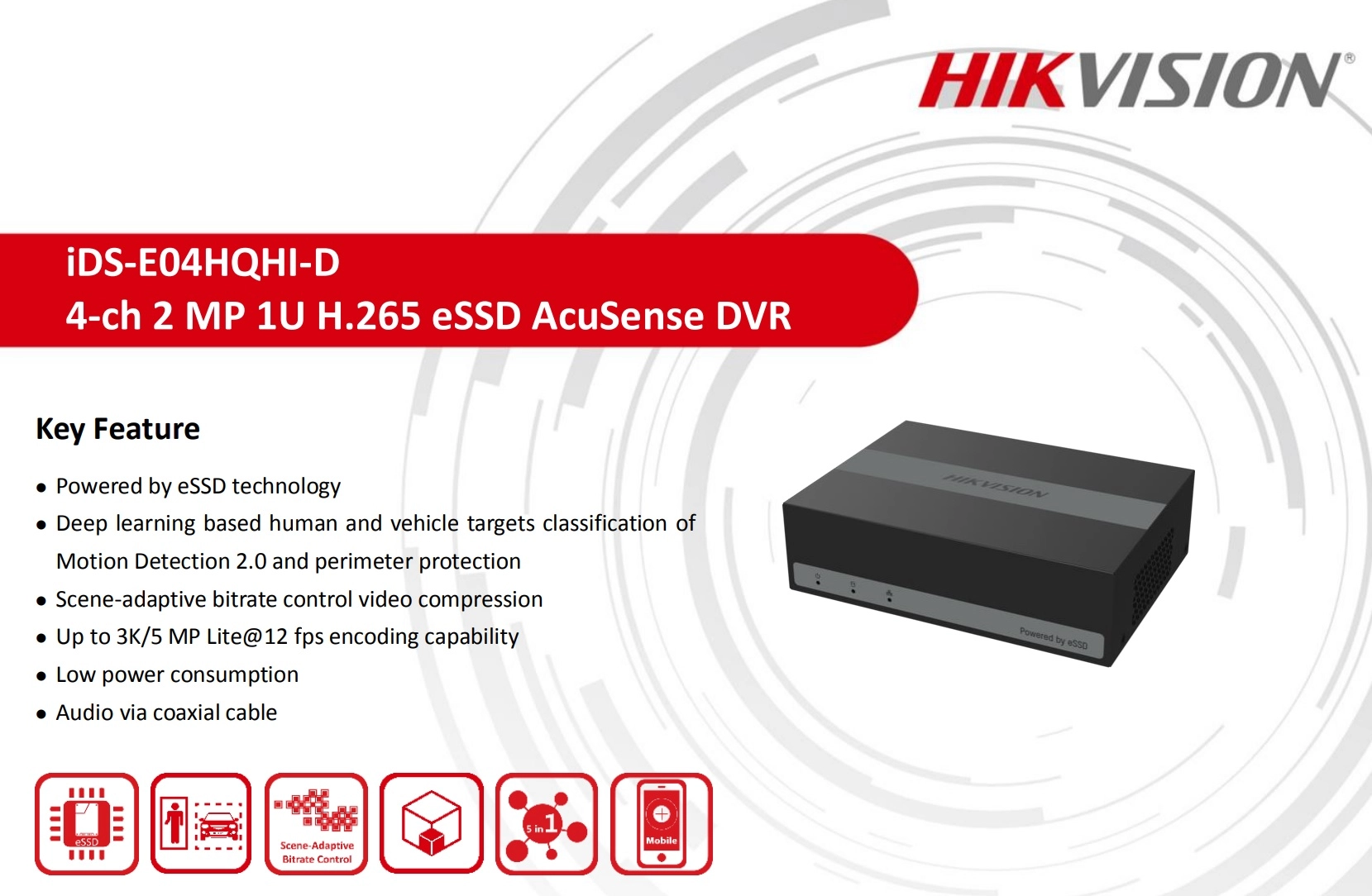 Grabador HIKVISION IDS-E04HQHI-D con 4 canales Full HD, tecnología H.265 Pro+ y salida HDMI/VGA. Ideal para sistemas de seguridad CCTV.