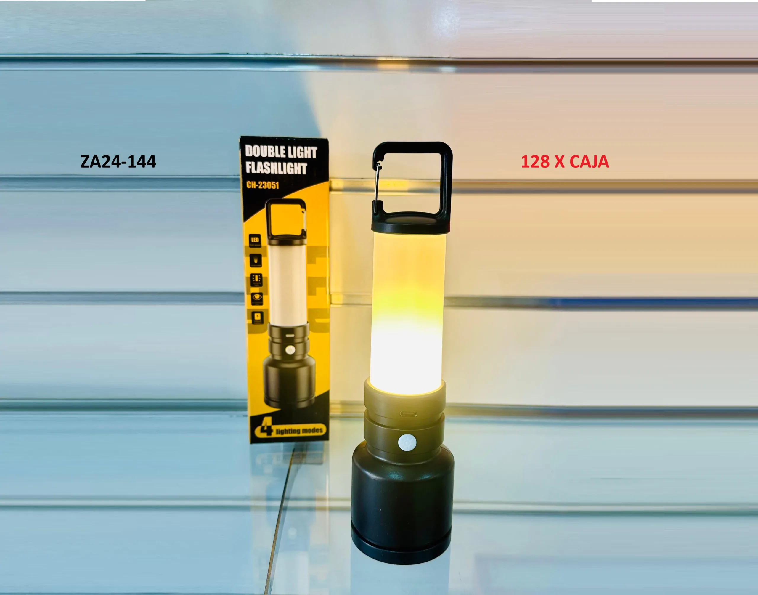 Linterna LED ZA24-144 recargable, diseño compacto y base ajustable. Ideal para camping, trabajos, emergencias y uso en exteriores.