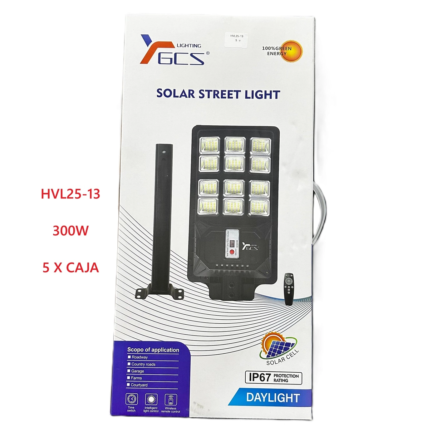Luz solar HVL25-13 de 300W, ideal para calles, patios y jardines. Iluminación autónoma, fácil instalación y gran resistencia a la intemperie.