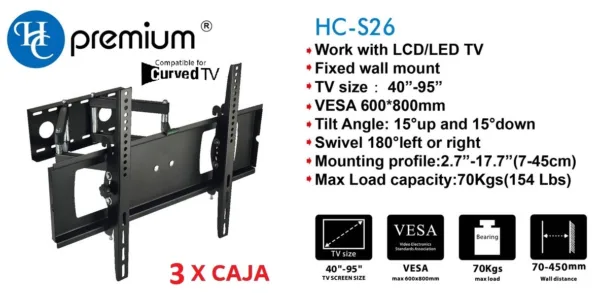 Combina funcionalidad, resistencia y diseño moderno con el SOPORTE PARA TV HC PREMIUM HC-S26, una opción práctica y segura para disfrutar la mejor experiencia visual.
