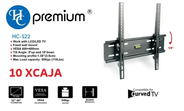 El Soporte para TV HC Premium HC-S22 es la solución perfecta para instalar tu televisor de manera segura, firme y elegante. Diseñado para pantallas de 26” a 55” pulgadas, ofrece una estructura de acero laminado en frío que proporciona resistencia y estabilidad en todo momento.